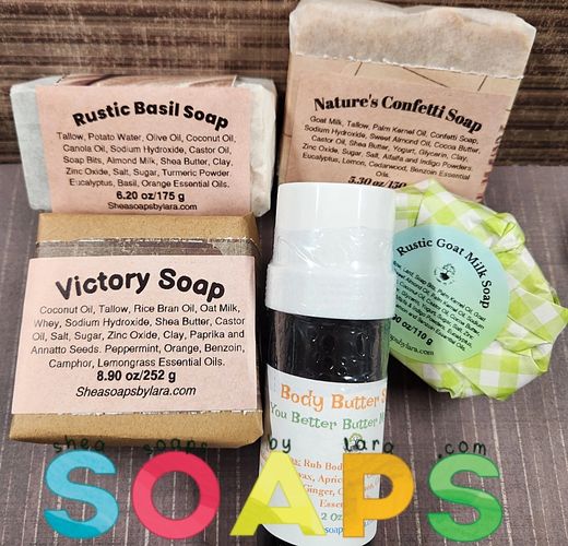 Shea Soaps by Lara is an Artisan Soap business. We make our Shea Butter soaps using the Hot Process Method and allow them to cure several weeks. Our rustic looking handmade soaps are made with Shea Butter (Refined or Organic Unrefined/Refined.) Our scented soaps contain pure Essential Oils. No artificial fragrances, Fragrance Oils, Parabens, Synthetic ingredients, nor Sodium Lauryl Sulfate are ever used in any of our handmade Shea Soaps by Lara soaps.